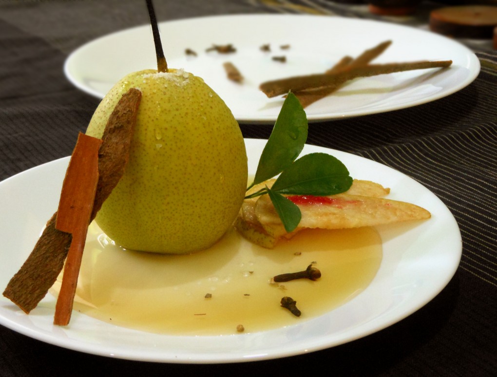 In a serving plate, spoon in 2bsp honey (diluted beforehand with 1 tsp warm water). Thinly slice your pears and arrange them carefully on the honeyed salver. Brush lightly with raspberry jam. Arrange a few candied bite-size pears on top. Finish by sprinkling rose powder mixed with ground cinnamon. Garnish with the lime sprig and a couple of cinnamon sticks.