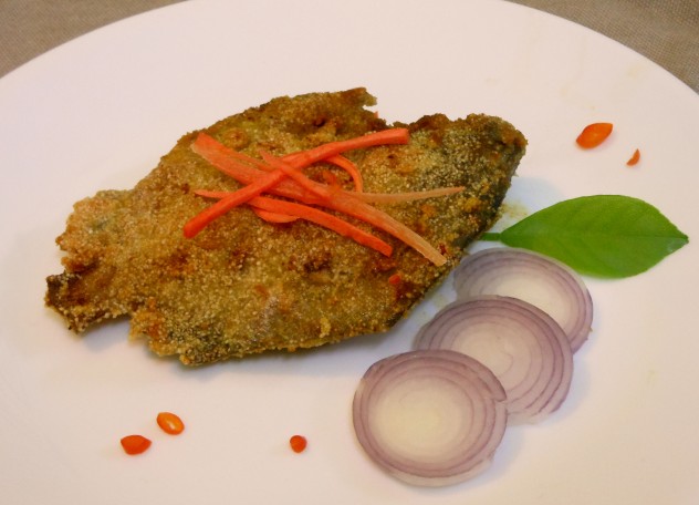 Meanwhile, mix the semolina and the flour in a flat dish. Set aside. Heat oil in a frying pan. Dredge the marinated pomfrets in the semolina-flour mixture and shallow fry (over a low flame) until golden brown and aromatic (roughly 7 minutes for each side; please do not turn the fish over until one side is completely cooked). Serve hot with julienned onions.